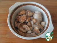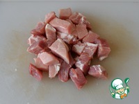 Свинину режем кубиками, обжариваем на максимальном огне до золотистости около 5 минут. |