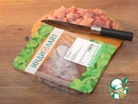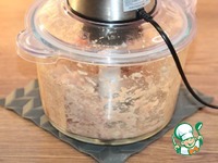 9. В чашу блендера кладем кусочки индейки, 0,5 часть лука, приправу для мяса 0,5 ч. л., солим и перчим. Измельчаем продукты блендером. |