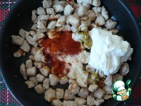 Обжарьте до золотистого цвета. Добавьте соль, сушеный чеснок, сладкую паприку, приправу для индейки, сметану и продолжайте обжаривать до готовности. |
