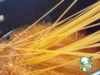 Добавить анчоусы, маслины, каперсы, томаты в собственном соку, соль, спагетти и 800 мл воды Готовить 10-12 минут до готовности спагетти Аль денте. |