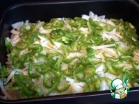 Сверху выложить курицу, пересыпать чесноком, посолить, поперчить. |