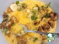 Взбить 7 яиц. Добавить их в салатницу с оставшимся оливковым маслом, горчицей, сыром, зелёным луком, солью, перцем, травами. Туда же выложить жареные шампиньоны. Перемешать. |