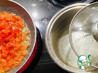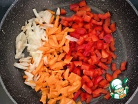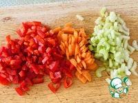 Нарезать лук, морковь, перец болгарский, сельдерей, разделить на две части |