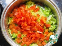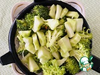 В кипящую воду опустить брокколи, вторую часть нарезанных овощей, перемешать, варить 10 минут |