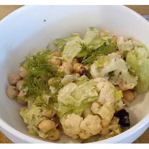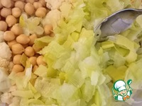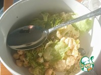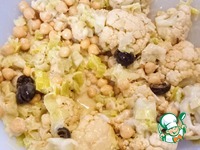 Тем временем ошпарить лук-порей кипятком, поддержать в кипятке 2 минуты. Затем процедить и отправить лук-порей в салатницу к нуту и цветной капусте. Перемешать. |