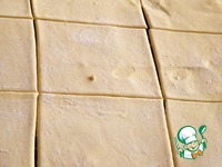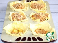 Слоеное тесто немного раскатать, разрезать на 12 квадратов и уложить их в форму для маффинов, предварительно смазанную растительным маслом. |