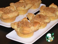 Разложить в формочки со слоёным тестом сначала часть штрейзеля, затем слой яблок и сверху посыпать оставшимся штрейзелем. |