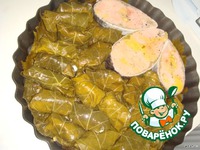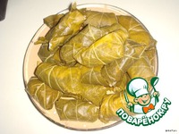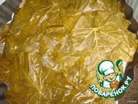 Беремся за виноградные листья. Свежих у нас не найти, купила в соли. Промыть. Приготовить сырную смесь: соединяем сыры, выдавленный зубчик чеснока, смешиваем всю эту массу. |