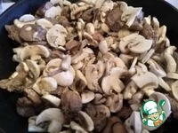 Грибы нарезать пластинами, довольно тонко. Слегка посолить и выложить к печени, здесь можно добавить чеснок. Тушить всё вместе минут 5-7. Грибы дадут сок. |