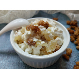 Описание: Незатейливый "зимний" вариант фруктового салата с творогом, консервированной грушей и вяленой шелковицей. Небольшой объём блюда отлично послужит десертом или перекусом.