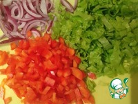 Листья салата, болгарский перец помыть, обсушить, нарезать полосками. Лук очистить и нарезать полукольцами. |