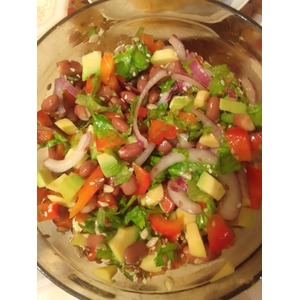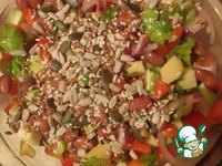 Соединить овощи, консервированную фасоль и кунжутную смесь и осторожно перемешать. Заправить оливковым маслом, слегка взбитым с лимонным соком и горчицей. |