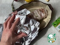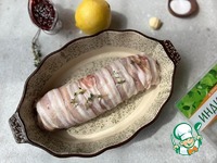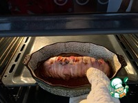 Сверху разместите наш руладин и с помощью плёнки заверните будущий руладин в бекон, плотно утягивая. |