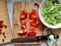 Нарезаем помидор. Я порезала небольшим кубиком. Отправляем в салатник, туда же - и колбаску. |