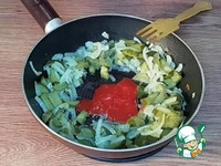 8. Затем добавляем томатную пасту 0,5 ст. л. (или 1 ст. л. кетчупа), перемешиваем и тушим еще 2 минуты. Снимаем зажарку с огня. |
