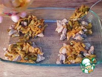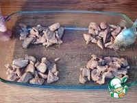 13. Берем форму для запекания или небольшой противень и смазываем маслом. Кладем обжаренное мясо и разделяем на 4 порции. |