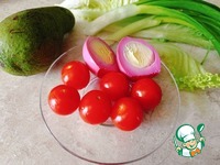 Нарезать авокадо кубиками, помидоры на четвертинки, зеленый лук и петрушку измельчить. Листья салата нарвать крупными кусочками. |