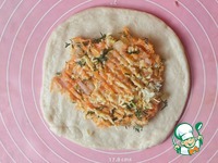 Раскатать в лепешку, сделать надрезы насквозь, как на фото. |