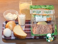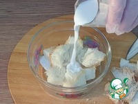 2. У кусочка хлеба отрезаем корочку. Делим кусочек на небольшие части и заливаем молоком 50 мл. |