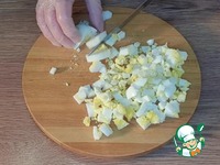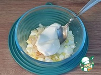 7. Смешиваем в миске охлажденный лук, яйца и плавленный сыр (1 ст. л.). Всыпаем специи. Сыр можно заменить мягким сливочным маслом. |