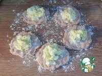 8. Влажными руками разделяем охлажденный фарш на лепешечки весом 65–70 г. У меня получилось 5 порций. На середину каждой лепешки кладем начинку по 1 ст. ложке. |