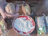 9. И влажными руками соединяем края лепешки, придавая форму пирожка или как у меня прямоугольник. Обваливаем заготовки в муке. |