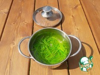 Налить в кастрюлю воду, довести до кипения, посолить. Варить горошек две минуты. Слить горячую воду и залить ледяной водой — так горошек сохранит свой яркий зеленый цвет. |