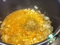 В казан добавить чесночно-имбирную пасту. Готовить минуту. Затем добавить куркуму и кориандр. Перемешать. |