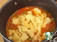 Наконец, добавить зелёный горошек, вернуть в казан отложенный картофель и 200 мл воды. Довести до кипения, уменьшить огонь и тушить 7 минут. Посолить по вкусу |