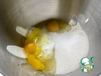 Заливка для начинки. Собрал в чаше миксера: сметану с сахаром, муку и ванильный сахар. Добавил в смесь яйца и хорошо, тщательно перемешал. Чтобы не было комочков. Скорость миксера - средняя. |