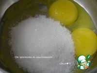 Желтки соедините в кастрюльке с сахаром и ванилином. |