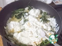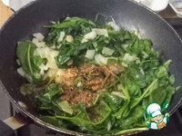 Отложить шпинат на одну сторону сковороды. На освободившемся месте разогреть масло, выложить лук, чеснок и немного соли по вкусу. Тушить 3 минуты. |