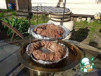Этажерку для тандыра надо застелить фольгой, уложить мясо на нитке. Из разогретого тандыра убрать угли. Поставить этажерку в тандыр. Готовить 25 минут. |
