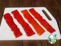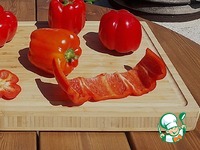 У перцев отрезать торцы, бочонок разрезать пополам, удалить семена. Должны получиться полоски. |