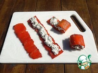 Смешать все ингредиенты для начинки и выложить на полоски перцев. |