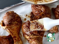 Застелил противень фольгой и выложил ножки рядком. Остатки маринада кисточкой по ним размазал. |