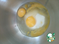В другую миску высыпаем 150 граммов сахара и разбиваем три яйца. |