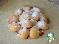 Добавьте половинки абрикосов, присыпьте оставшимся сахаром с крахмалом. |