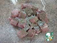 Мясо (лопаточная часть без кости) нарезать на кубики, тпосыпать тимьяном, перцем, тмином и солью. Оставить мариноваться, пока готовим овощи. |