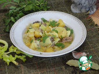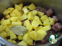 Добавить мясо, сельдерей, картофель, лавровый лист и залить горячей водой. Перемешать, накрыть крышкой и варить на медленном огне около часа. Какой аромат витал на кухне! |
