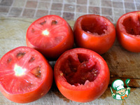 У 5 крупных толстокожих помидоров срезать крышечку, ложкой аккуратно вынуть мякоть. Сок, выделяющийся из помидоров, не выливать. |