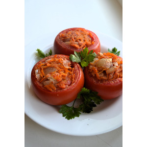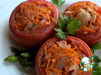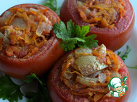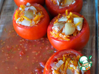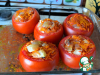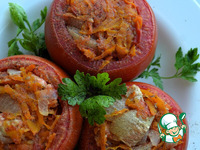 Нафаршировать помидоры остывшей мясной начинкой. Выложить помидоры в огнеупорную форму. На дно формы вылить сок помидоров. Запекать при 180° 20 минут. |
