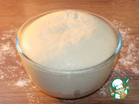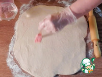 7. Тесто увеличилось. Подпыляем столешницу мукой и выкладываем подошедшее тесто, обминаем и раскатываем по форме прямоугольник, толщиной 5 мм. |
