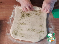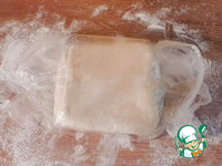 10. За это время, тесто стало мягким и пластичным. Вновь раскатываем тесто в прямоугольник, смазываем и складываем. Накрываем прозрачным пакетом и оставляем на 10 минут. |