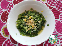 Измельчить зубчик чеснока, всыпать соль и щепотку душицы. Измельчить мякоть небольшой дольки апельсина и выжать сок. |