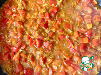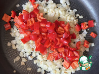 На разогретом оливковом масле обжарить минут пять лук, добавить чеснок, минуты через две добавить сладкий перец, обжаривать минут пять. |