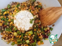 В салатницу выложить обжаренную кукурузу, брокколетти и фасоль. |