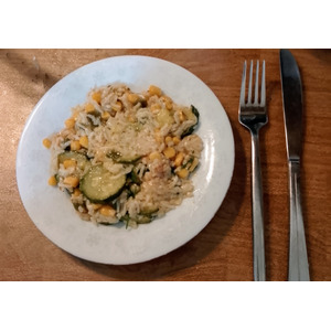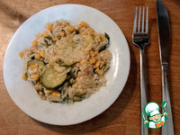 Описание: Рисовая запеканка из цуккини и кукурузы с сырной корочкой - яркое, богатое на вкус блюдо палестинской кухни, гармонично сочетающее в себе сладость кукурузы, нежную текстуру цуккини с ароматными травами, специями и расплавленным сыром.