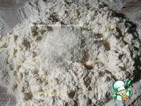 Муку смешайте с разрыхлителем и солью, просейте 2 раза. Сливочное масло порубите с мучной смесью в крошку, переложив на рабочую поверхность, добавьте кокосовую стружку и сахарную пудру, перемешайте. |