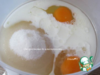 Яйца, сахар, молоко и растительное масло выложите в чашу для взбивания. Взбейте с помощью миксера до однородности. |